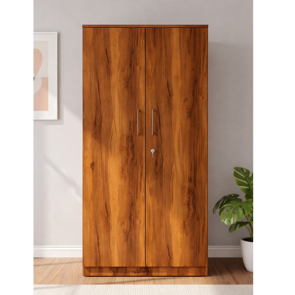 - Two-door wardrobe with multiple shelves & A drawer for organizing clothes and storage